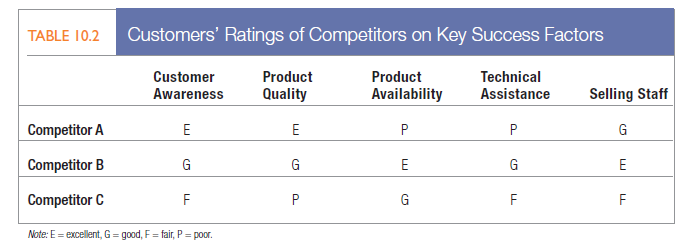 Table 10.2 shows the results of a company survey that asked customers to rate its three competitors, A, B, and C, on five attributes. Competitor A turns out to be well known and respected for producing high-quality products sold by a good sales force, but poor at providing product availability and technical assistance. Competitor B is good across the board and excellent in product availability and sales force. Competitor C rates poor to fair on most attributes. This result suggests that in its positioning, the company could attack Competitor A on product availability and technical assistance and Competitor C on almost anything, but it should not attack B, which has no glaring weaknesses. As part of this competitive analysis for positioning, the firm should also ascertain the strategies and objectives of its primary competitors.
