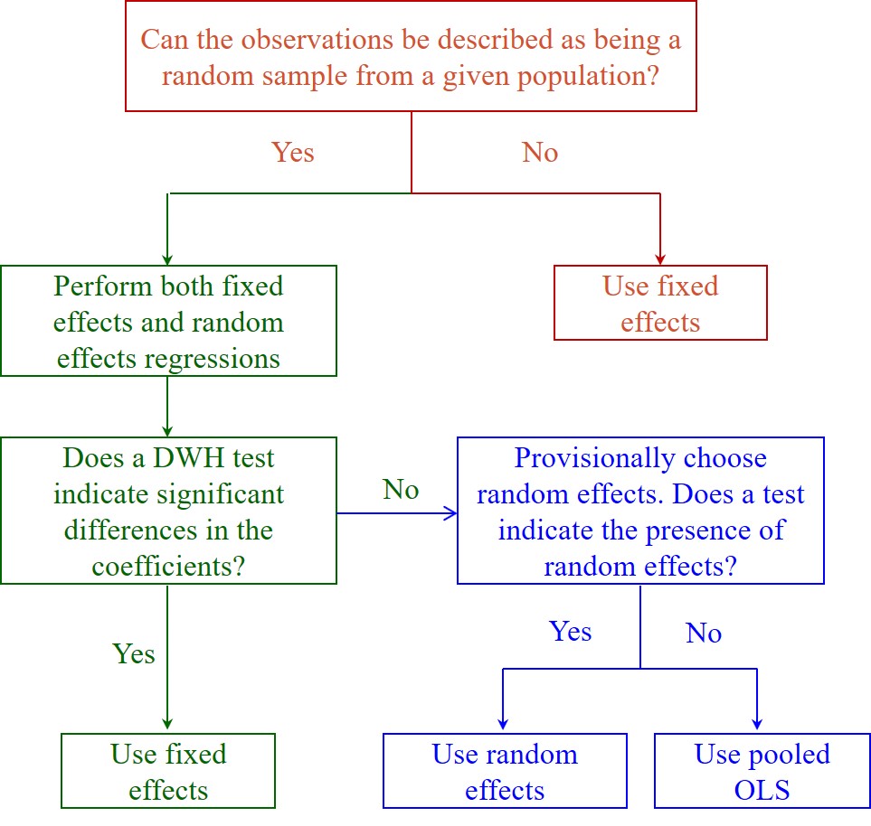 For comparing fixed and random-effects models, we perform now the Hausman test by typing” hausman fixed random