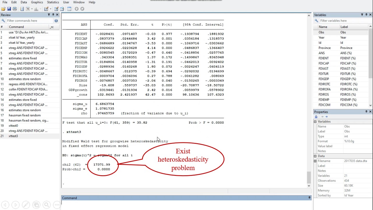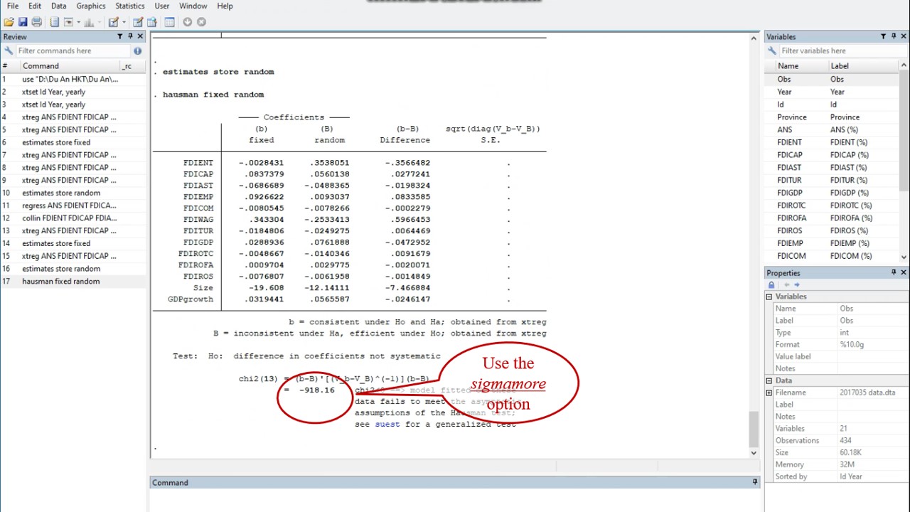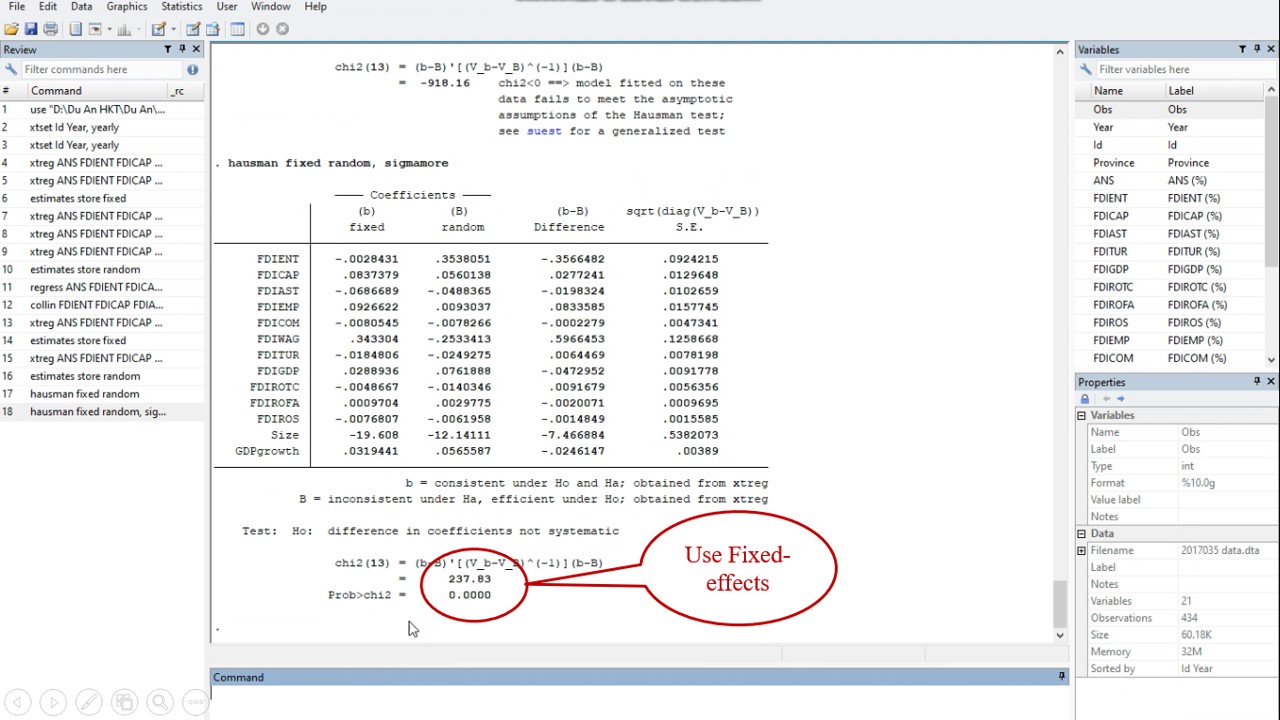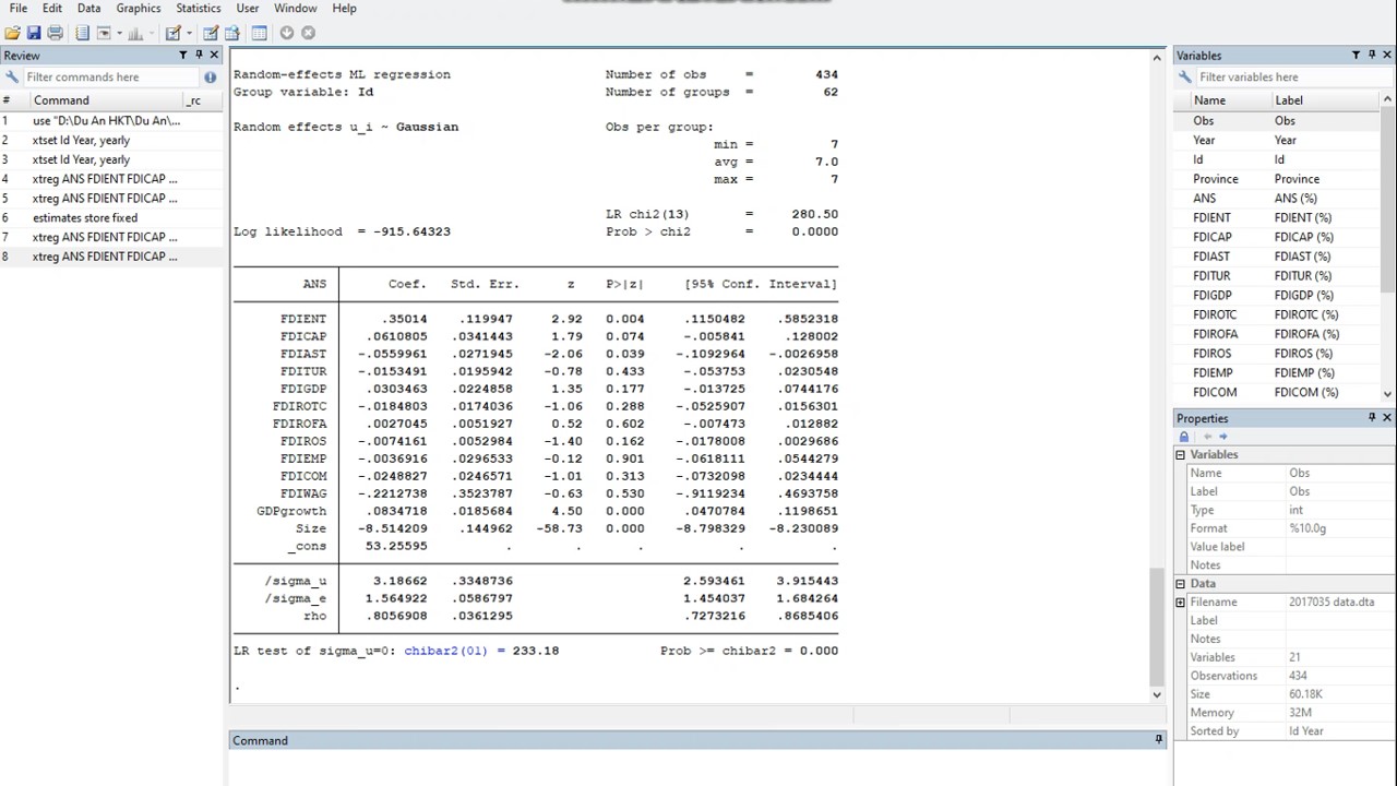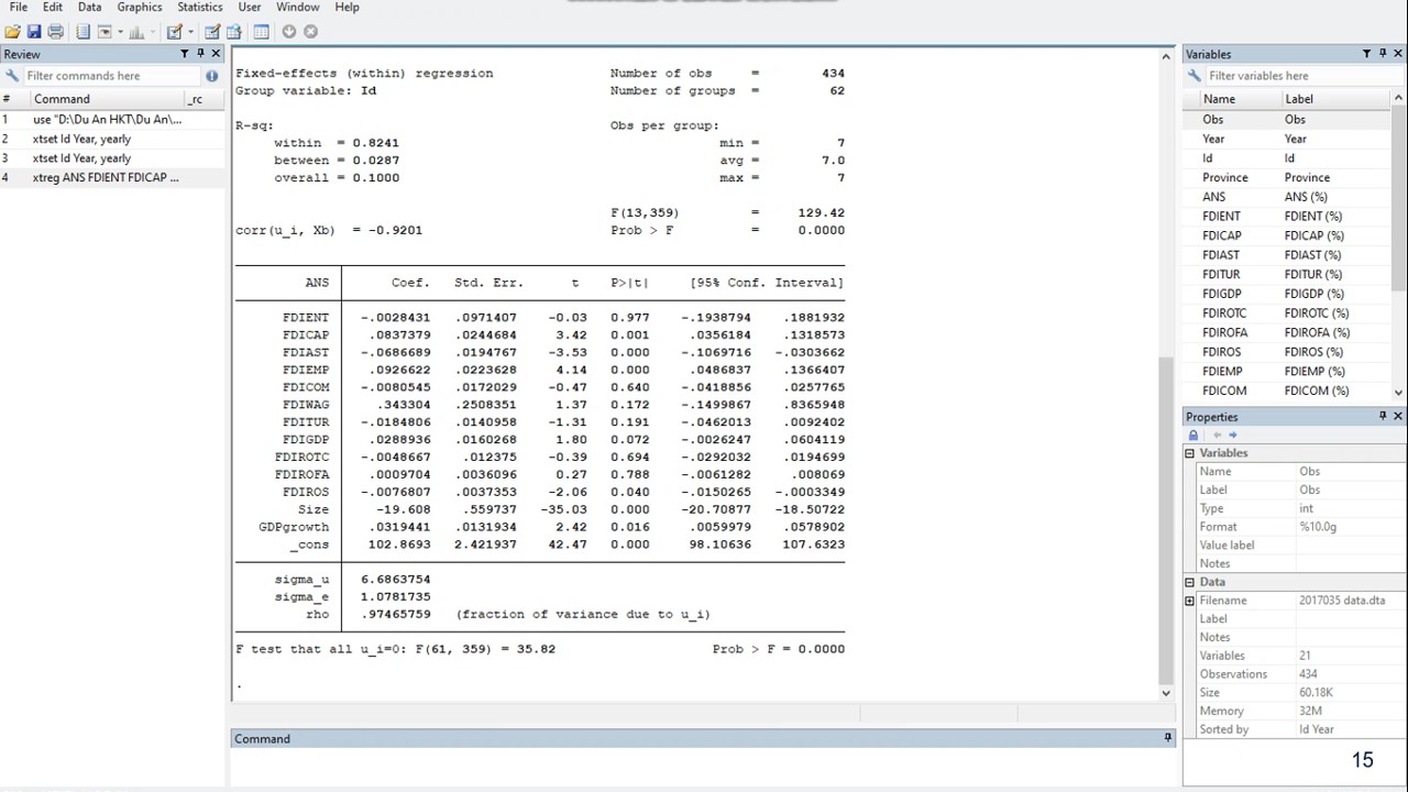 As the panel data has been handled, we can now run the fixed-effects model by using the Stata command xtreg with dependent variable ANS and 13 variables, including 11 independent ones and 2 control variables in our panel data.