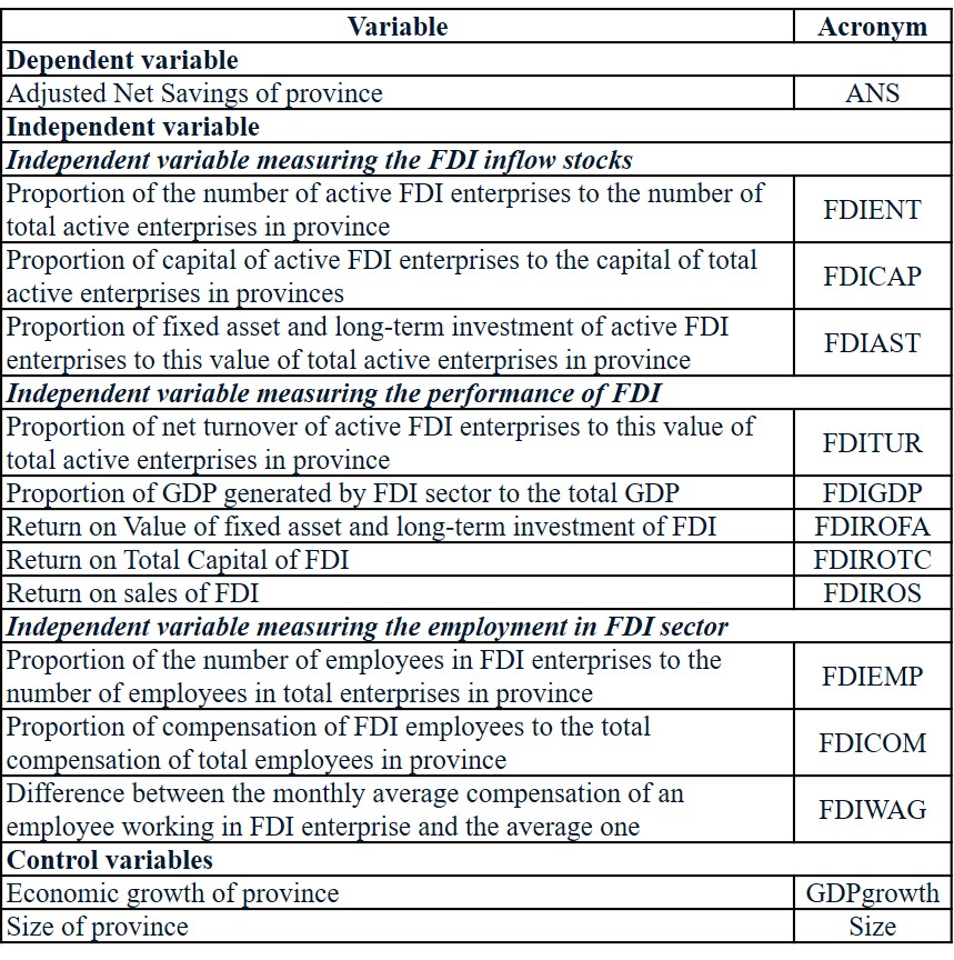 Here are the variables of our research; in which Dependent variable is the adjusted net savings that assess the sustainable development of Vietnam provinces. In total, we have 11 independent variables that are distinguished in three groups, including: 3 variables associated with the FDI inflow stocks; 5 variables associated with the employment in FDI sector, and 3 variables associated with the performance of FDI in provinces. And, 2 control variables are size and economic growth of province.