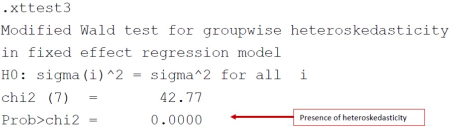 We must check the Heteroskedasticity test for the selected Fixed-effects model by using the command xttest3. This is a user-written program, to install it type: ssc install xtest3