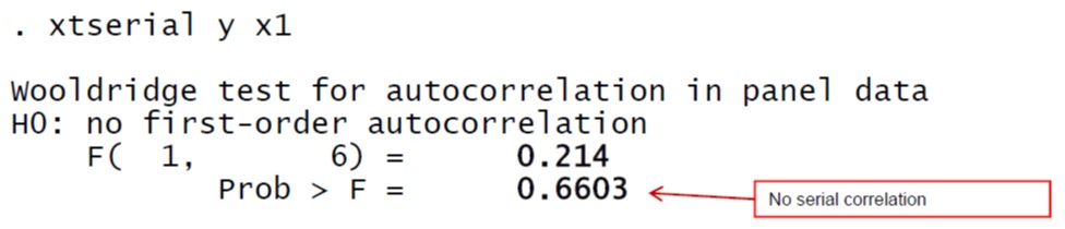 The null is no serial correlation. Above we fail to reject the null and conclude the data does not have first-order autocorrelation. Type help xtserial for more details.