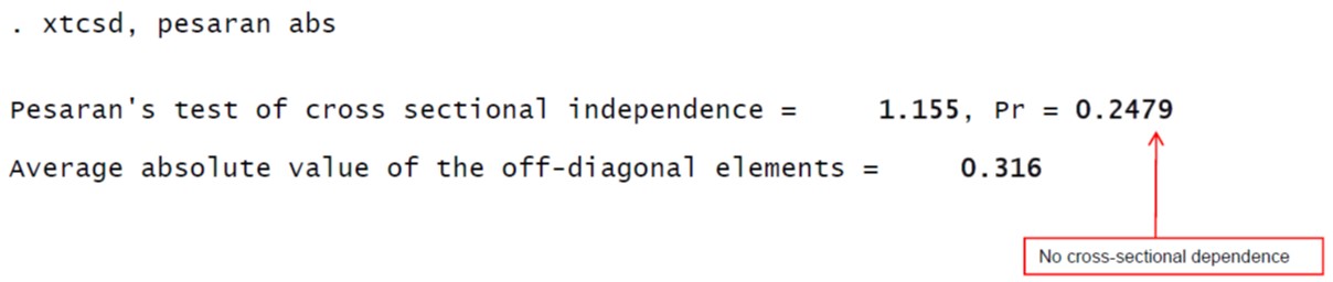 Pasaran CD (cross-sectional dependence) test is used to test whether the residuals are correlated across entities*. Cross-sectional dependence can lead to bias in tests results (also called contemporaneous correlation). The null hypothesis is that residuals are not correlated.
