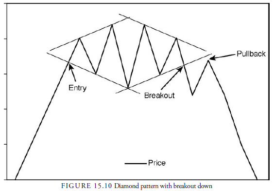 One of the less frequent but profitable patterns is the diamond (see Figure 15.10). It consists of a combination of a broadening pattern and a symmetrical triangle and usually occurs at the top of a sharp upward rise in prices. It is rare at price bottoms.