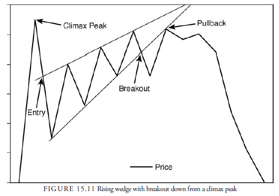 At a climax peak, when the test is a rising wedge pattern, the odds are extremely high that the breakout will be downward. Because the emotion and commitment have been exhausted at the climax peak and are unable to return during the test, the downward break in the wedge pattern is the sign of a longer-term downward reversal. Thus, the wedge is a reversal pattern, even though it may not occur at the actual climax peak high.