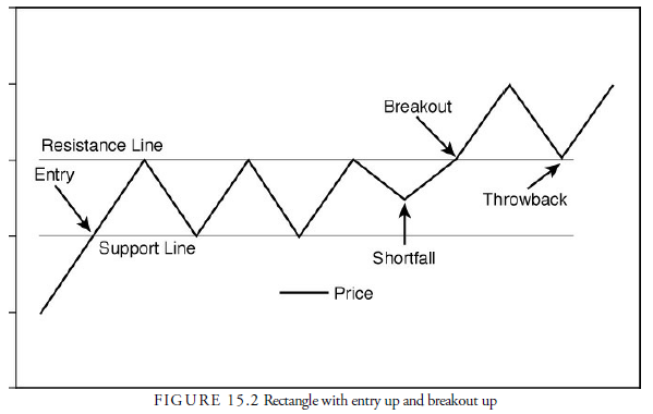 Within the rectangle formation, prices do not necessarily always reach the two zones but may fall short (a “shortfall” or “partial”). Sometimes this is a warning as to the direction of the eventual breakout. As an example, when well along the way of the formation of a rectangle, prices begin to reverse before declining all the way to the underlying support zone; buyers are getting a little more anxious and the odds increase for a breakout upward. Bulkowski reported that such a shortfall within the latter stages of the pattern is accurate 60% to 90% of the time in predicting the direction of eventual breakout depending on the breakout direction. More than half the time, prices throw back or pull back to the breakout zone, providing another action point but one with less profit potential. Edwards and Magee estimated that about 40% of the time, a pullback or throwback would occur. When the breakout occurs on a gap, the odds decrease that a retracement will occur.