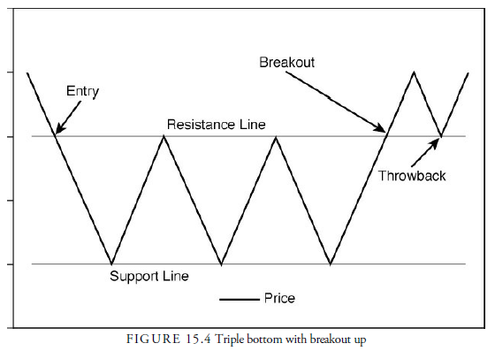 The triple top and bottom formation is just a rectangle with the number of touches to the support or resistance line being three. It is, thus, more specific than the rectangle and is less common. Each peak in the top should be at the same level and have roughly the same shape. The middle peak can be slightly lower than the other two. As in the double formations, confirmation only comes with a price breakout below the two bottoms. Pullbacks are common (63% of the time) and diminish the breakout performance. Tops only project 40% of the formation width below the breakout level but reach the projection within the first two weeks. Figure 15.3 shows a triple top with a breakout down, and Figure 15.4 shows a triple bottom with a breakout up. As you can see, they are the mirror image of each other. Sometimes in a triple bottom, the second peak is slightly higher than the first. This is favorable, and the breakout is the line between the two peaks. The patterns are rare and usually depend on the underlying market trend. They rank in the top third of classic patterns. Their failure rates very low (10% for bottoms, 4% for tops).