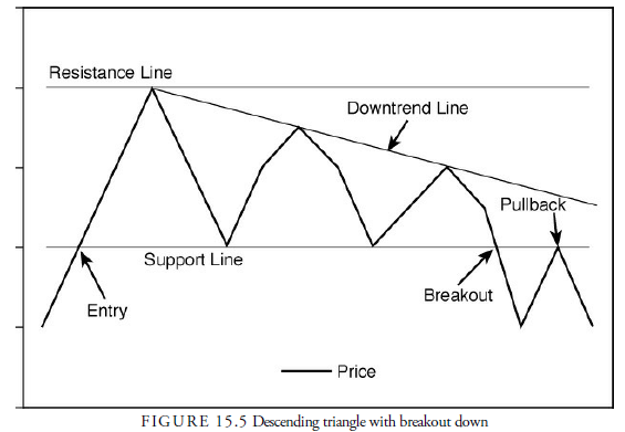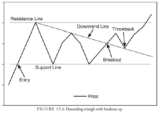 Figure 15.5 shows a descending triangle with a breakout down. Its bounds are a lower horizontal support line and a declining upper trend line; price should touch each line at least twice and should generally “fill” the triangle’s space. It can be entered from any direction. The breakout is more common to the downside (64%), but the upward breakout is more reliable and profitable (47% to 16% average gain). This formation can be stretched high and wide and is sometimes difficult to recognize. The trend lines defining its boundaries are almost never exact and are loaded with false intrabar breakouts. A strict breakout strategy is required, therefore, as we discussed in Chapter 13. However, prices often explode out of it and produce sizable gains. It can also be wild and guarantee an exciting ride. It will break out and run, break out and pull back to its trend line, break out and pull back to its cradle, or break back through the cradle, create a sizable trap, and then reverse back in its original breakout direction and run. In other words, when you enter on a breakout from a descending triangle, the subsequent action must be watched carefully.