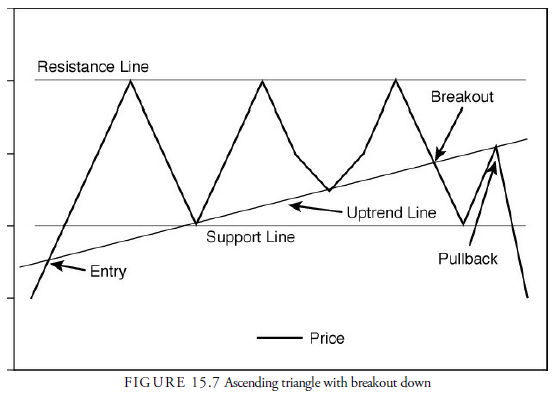 A horizontal upper bound of resistance combined with an upward sloping lower bound of support defines an ascending triangle (shown in Figure 15.7 with a breakout down). The characteristics in this pattern are just as erratic as in descending triangles—lots of action up and down. Breakout points must be chosen carefully because of the pattern’s nature to have many small false breakouts, and declining volume is common but not necessary. Upward breakouts occur 77% of the time, and breakouts happen roughly 61% of the distance (time) from the base to the cradle. The overall performance rank is roughly in the middle of all patterns, with a little more favorable for downward breakouts. Failure rates are between 11% and 13% depending on breakout direction. This is about average.