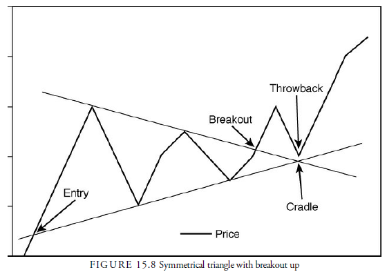 There are many old rules about when a breakout should occur within a triangle. Some, such as Murphy, say that one-half to two-thirds the distance from the base to the apex is appropriate. Others, such as Edwards and Magee, use the one-half to three-quarters rule. In fact, the breakout can occur at any time once the triangle has been defined by legitimate upper and lower converging trend lines. Edwards and Magee do point out that the longer the distance, the more likely the performance will be less, but this also is not necessarily true. The highest percentage performance does come from breakouts generally around 60%-70% of the distance from the base to the cradle. However, in symmetrical triangles, the best performance comes from late breakouts in the 73%-75% distance. Thus, the old rules are partially correct but not strictly so.