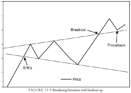Broadening formations are the least-useful patterns for a number of reasons. First, they are relatively rare in occurrence and are often difficult to identify. Second, and more important, they are difficult to profit from. Because the boundary trend lines are separating over time, the breakout lines are constantly moving away from each other. In an upward breaking broadening pattern, this means the upper breakout level is getting higher and higher along the upper trend line (refer to Figure 15.9). By getting higher and higher, not only is it using up much of any potential gain after a breakout, but it is moving farther from any realistic protective stop level, thus increasing the risk. Finally, the raw performance statistics show that performance of a broadening pattern is average at best, and its failure rate is above average. One of the most profitable patterns utilizing a broadening pattern, however, is when it is combined with a symmetrical triangle into a diamond top, which we discuss next.