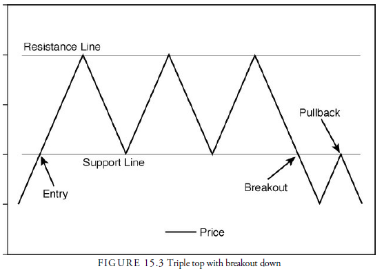 The triple top and bottom formation is just a rectangle with the number of touches to the support or resistance line being three. It is, thus, more specific than the rectangle and is less common. Each peak in the top should be at the same level and have roughly the same shape. The middle peak can be slightly lower than the other two. As in the double formations, confirmation only comes with a price breakout below the two bottoms. Pullbacks are common (63% of the time) and diminish the breakout performance. Tops only project 40% of the formation width below the breakout level but reach the projection within the first two weeks. Figure 15.3 shows a triple top with a breakout down, and Figure 15.4 shows a triple bottom with a breakout up. As you can see, they are the mirror image of each other. Sometimes in a triple bottom, the second peak is slightly higher than the first. This is favorable, and the breakout is the line between the two peaks. The patterns are rare and usually depend on the underlying market trend. They rank in the top third of classic patterns. Their failure rates very low (10% for bottoms, 4% for tops).
