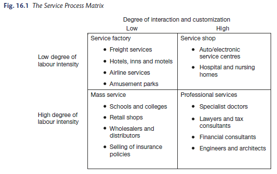 From the point of view of service quality, it is easier to manage the category of services coming under the service factory as these involve a low degree of labour intensity as well as a low degree of interaction and customization, while it is most difficult to manage the service quality of the professional services category, which involves a high degree of interaction and customization and a high degree of labour intensity. For service shop and mass services that involve a low-high combination of the two variables in the matrix, service quality management has a moderate level of difficulty.