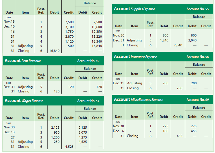 As shown in Exhibit 6, the closing entries are normally identified in the ledger as “Closing.” In addition, a line is often inserted in both balance columns after a closing entry is posted. This separates next period’s revenue, expense, and dividend transactions from those of the current period. Next period’s transactions will be posted directly below the closing entry.