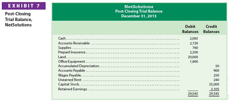 A post-closing trial balance is prepared after the closing entries have been posted. The purpose of the post-closing (after closing) trial balance is to verify that the ledger is in balance at the beginning of the next period. The accounts and amounts should agree exactly with the accounts and amounts listed on the balance sheet at the end of the period. The post-closing trial balance for NetSolutions is shown in Exhibit 7.