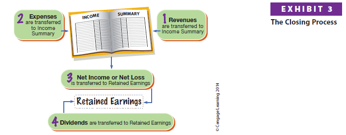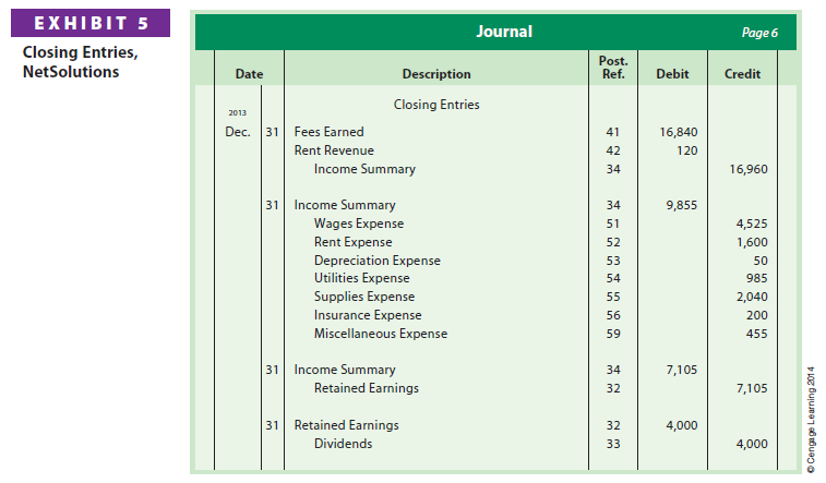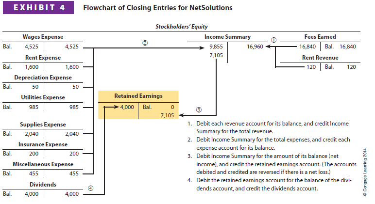 A flowchart of the four closing entries for NetSolutions is shown in Exhibit 4. The balances in the accounts are those shown in the Adjusted Trial Balance columns of the end-of-period spreadsheet shown in Exhibit 1.