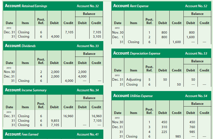 As shown in Exhibit 6, the closing entries are normally identified in the ledger as “Closing.” In addition, a line is often inserted in both balance columns after a closing entry is posted. This separates next period’s revenue, expense, and dividend transactions from those of the current period. Next period’s transactions will be posted directly below the closing entry.