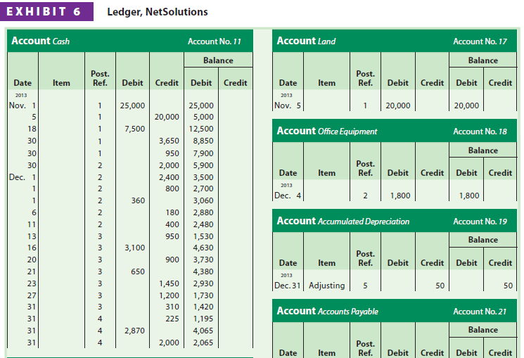 After the adjusting entries are posted to NetSolutions’ ledger, shown in Exhibit 6 (on pages 160-161), the ledger agrees with the data reported on the financial statements.