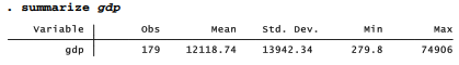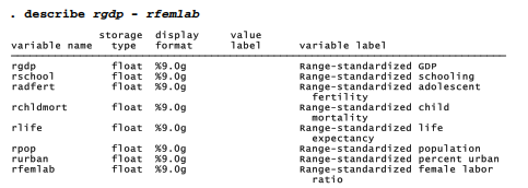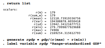 Range standardization involves dividing each variable by its range. There is no command to do this directly in Stata, but we can improvise one easily enough. To do so, we make use of results that Stata stores unobtrusively after summarize. Recall that we can see a complete list of stored results after summarize by typing the command return list. (After modeling procedures such as regress or factor, use the command ereturn list instead.) In this example, we view the results stored after summarize pop, then use the maximum and minimum values (stored as scalars that Stata calls r(max) and r(min)) to calculate a new, range-standardized version of population.