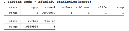If our generate commands were done correctly, these new range-standardized variables should all have ranges equal to 1. tabstat confirms that they do.
