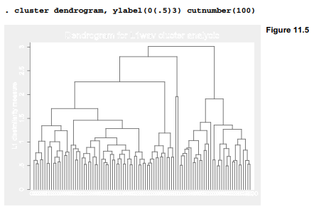 As Figure 11.6 shows, there are 15 groups remaining at dissimilarities above 1.2. For purposes of illustration, we will consider only the top four groups, which have dissimilarities above 2. cluster generate creates a categorical variable for the final four groups from the cluster analysis we named Llwav.