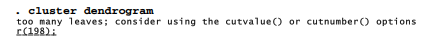 Following the error-message advice, Figure 11.5 employs a cutnumber(100) option to form a dendrogram that starts with only 100 groups, after the first few fusions have taken place.