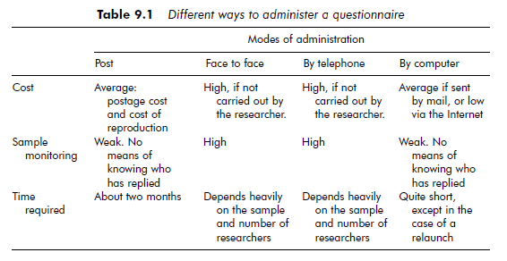 Some of the advantages and disadvantages inherent to the different methods of administering questionnaires are presented in Table 9.1.
