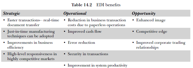 EDI is a new emerging technology used for transfer of business documents from one computer to another. Traditionally, business documents such as invoices, challans, cheques and drawings are sent through mail, fax or courier. However, with EDI these documents are transferred electronically from one organization to another. In short, EDI is a drive toward paperless document transfer or transactions. EDI will emerge in strategic areas such as the provision of better levels of customer service and improved marketing competitiveness. The benefits of EDI include the following (see Table 14.2).