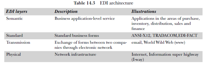 The different industries have developed their own communication and message standards for use. However, for large-scale usage of EDI in business, a uniform standard has to be developed. EDI operates through four layers of architecture as shown in Table 14.3.