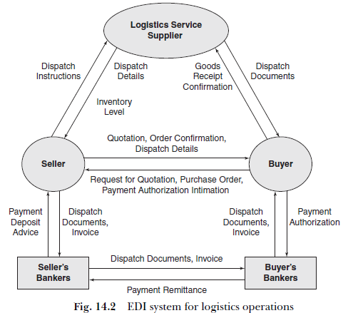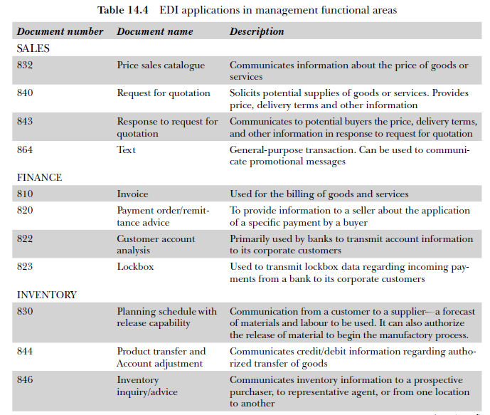 Usage of EDI in the area of inbound logistics between the manufacturer and supplier will ensure substantial saving on transaction cost for both the parties. Similarly, using EDI between the manufacturer and the customer will ensure reduction in order cycle time and inventory, which will help the customer to enhance his competitiveness. Thus, the sharing of the benefits of EDI by both seller and buyer will result in creation of a partnership spirit leading to high switching cost for the customer and creating barriers for competitors. Today, EDI is widely used in banks, marketing, customs, logistics and finance companies, as well as in international trade in the developed countries. Table 14.4 shows the different applications in various functional areas of management.