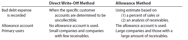 The primary differences between the direct write-off and allowance methods are summarized below.