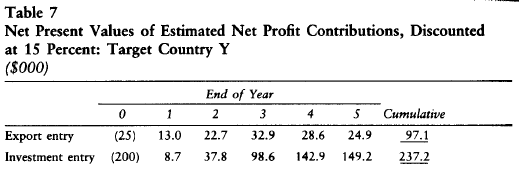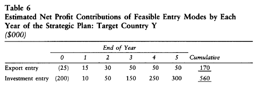 Tables 6 and 7 illustrate a comparative profit contribution analysis in a situation where only two entry modes have passed the feasibility test. This example is simplified, because, as we know, there are several forms of export and investment entry. The planning horizons of the different entry modes can always be made the same by using terminal values, but here we simply assume identical horizons.