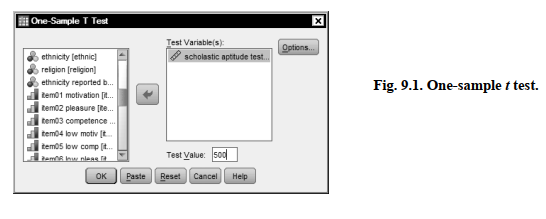 Sometimes you want to compare the mean of a sample with a hypothesized population mean to see if your sample is significantly different. For example, the scholastic aptitude test was originally standardized so that the mean was 500 and the standard deviation was 100. In our modified HSB data set, we made up mock scholastic aptitude test – math (SAT Math) scores for each student. You may remember from Chapter 3 that the mean SAT Math score for our sample was 490.53. Is this significantly different from 500?