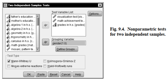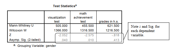 The second table provides the Mann-Whitney U, z score, and the Sig. (significance) level or p value. Asymptotic (“Asymp.”) significance refers to the fact that the significance levels are not exact. Note that the mean ranks of the genders differ significantly on visualization test and math achievement but not on grades in high school, as was the case for the similar t tests in Problem 9.2. The Mann-Whitney test is only slightly less powerful than the t test, so it is a good alternative if the assumptions of the t test are violated, as was actually the case with visualization test. Note that you would not report both t tests and Mann-Whitney tests for the same variables because they provide very similar information.