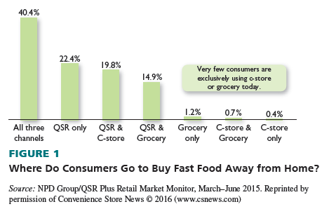 C-stores and grocery stores, historically different, now compete in the same space as traditional QSRs for the same customer and the same occasion. Most customers use multiple channels to purchase food for immediate consumption. Fewer than one in four U.S. consumers are exclusive QSR users for these meal occasions. Those who are exclusive QSR customers are just as likely to dine in or take away as other QSR users. Off-premise visits made by exclusive QSR buyers are likely vulnerable to shifts to other channels. The extent of the customer-sharing, as seen through NPD research, demonstrates the channel blurring happening among retail and traditional quick foodservice segments.