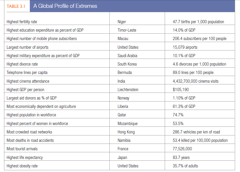 Marketers also have extensive information about how consumption patterns vary across and within countries. On a per capita annual basis, for example, the Irish consume the most chocolate (24.7 lbs.), Czechs the most beer (131.7 liters), the French the most wine (45.7 liters), and Greeks the most cigarettes (4,313).3 Table 3.1 summarizes other comparisons across countries. Consider regional differences: Seattle’s residents buy more sunglasses per person than in any other U.S. city; people in Salt Lake City (and Utah) eat the most Jell-O; Long Beach, CA, residents eat the most ice cream; and New York City dwellers buy the most country music CDs.4