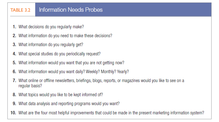 The company’s marketing information system should combine what managers think they need, what they really need, and what is economically feasible. An internal MIS committee can interview a cross-section of marketing managers to discover their information needs. Table 3.2 displays some useful questions to ask them.