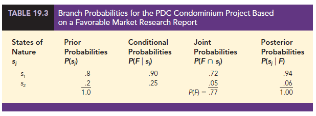 Table 19.3 shows that the probability of obtaining a favorable market research report is P(F) = .77. In addition, P(s1 | F) = .94 and P(s2 | F) = .06. In particular, note that a favorable market research report will prompt a revised or posterior probability of .94 that the market demand of the condominium will be strong, s1.
