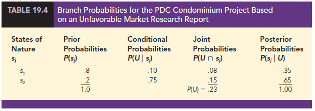 The tabular probability computation procedure must be repeated for each possible sample information outcome. Thus, Table 19.4 shows the computations of the branch probabilities of the PDC problem based on an unfavorable market research report. Note that the probability of obtaining an unfavorable market research report is P(U) = .23. If an unfavorable report is obtained, the posterior probability of a strong market demand, s1, is .35 and of a weak market demand, s2, is .65. The branch probabilities from Tables 19.3 and 19.4 were shown on the PDC decision tree in Figure 19.5.