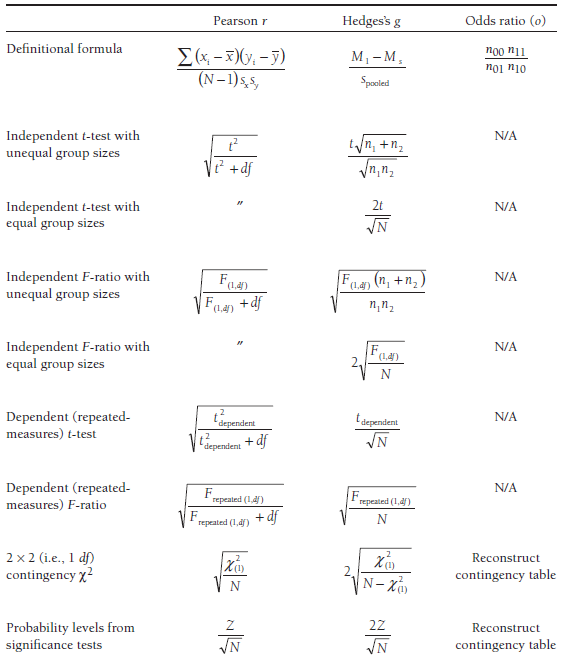 You can compute r from a wide range of results reported in primary studies. In this section, I describe how you can compute this effect size when primary studies report correlations, inferential statistics (i.e., £-tests or F-ratios from group comparisons, x2 from analyses of contingency tables), descriptive data, and probability levels of inferential tests. I then describe some more recent approaches to computing r from omnibus test results (e.g., ANOVAs with more than two groups). Table 5.1 summarizes the equations that I describe for computing r, as well as those for computing standardized mean differences (e.g., g) and odds ratios (o).