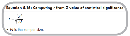 After computing Z, it is straightforward to compute the corresponding effect size given this value and sample size. The following equation converts Z to r for a given sample size N: