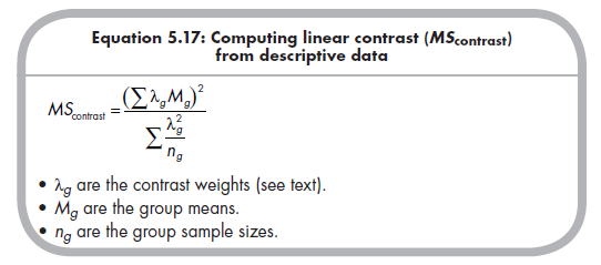 After determining appropriate contrast weights (Ag), the next step is to use these and the reported group sizes (ng) and means (Mg) to compute the average squared deviation due to the linear contrast, MScontrast:
