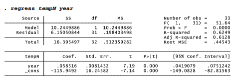 This section introduces some additional graphics that help to visualize a regression model or diagnose possible problems. Continuing with the Arctic9.dta data, variable tempN describes mean annual air temperature anomalies for the entire region from 64 to 90 degrees north latitude, estimated from land and sea surface records by NASA. Temperature anomalies represent differences, in degrees Celsius, from regional temperatures over the reference years 1951-1980. Positive anomalies thus represent above-average temperatures, relative to 1951-1980.