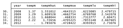 Then repeat the regression to obtain predicted values and standard errors of forecasts (stdf). Upper and lower 95% confidence limits are approximately the predicted values minus or plus twice the standard error of forecasts: tempNhat minus or plus 2*tempNse.