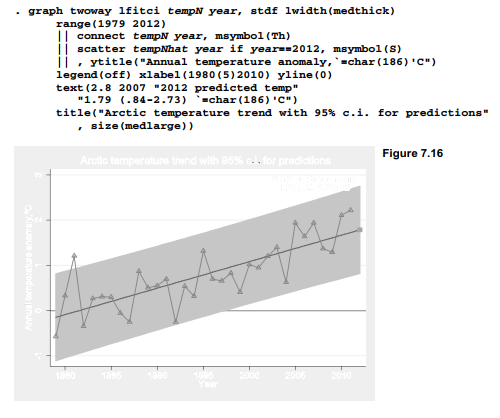 Figure 7.15 plots this upward trend in Arctic temperature anomalies. Actual temperatures are overlaid on regression line with 95% confidence interval for the conditional mean, as specified by the twoway lfitci, stdp part of this command. Other options call for a medium-thick regression line, and medium-large text for the main title. A degree symbol, ASCII character 186, is inserted in the y-axis title (see Figure 3.16 in Chapter 3 for other ASCII characters).