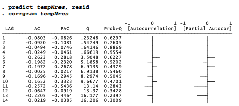 The Q tests in this output do not approach statistical significance at any lags from 1 to 14 years. Thus, corrgram more persuasively agrees with estat dwatson in finding no significant autocorrelation among residuals from the temperature model. The tests and confidence intervals in this section are not called into question.