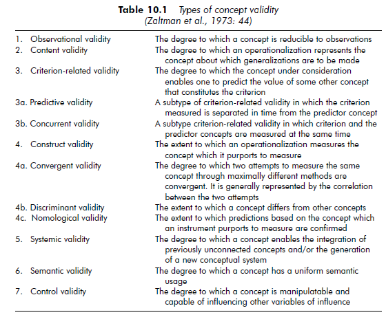The concept of construct validity is peculiar to the social sciences, where research often draws on one or several abstract concepts that are not always directly observable (Zaltman et al., 1973). These can include change, performance, or power. Concepts are the building blocks of propositions and theories used to describe, explain or predict organizational phenomena. As they are abstract forms that generally have several different meanings, it is often difficult to find rules to delimit them. Because of this it is important that the researcher’s principal concern is the need to establish a common understanding of the concepts used. This poses the question of the validity of these concepts, and in the following discussion and in Table 10.1 we present several different approaches to concept validity (Zaltman et al., 1973).