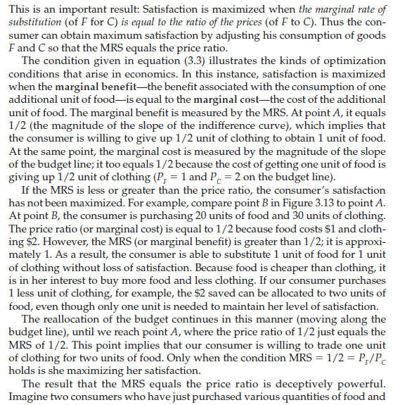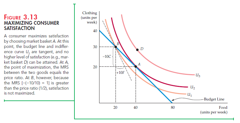 These two conditions reduce the problem of maximizing consumer satisfaction to one of picking an appropriate point on the budget line.