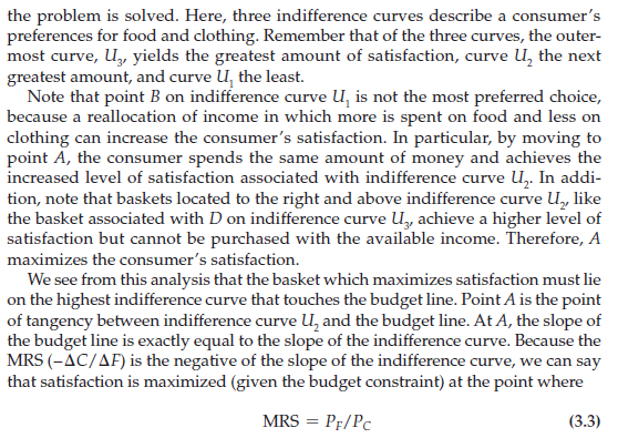 These two conditions reduce the problem of maximizing consumer satisfaction to one of picking an appropriate point on the budget line.