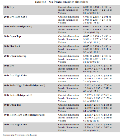 Ports and shipping industry world over has accepted that containerization is the future of shipping and initiated projects for keeping pace with the latest developments. The ship builders have already started building huge container carrier cargo ships having capacity of more than 6000 TEUs. The ports are also gearing up to meet these challenges. Some ports such as Heliex, Canada, have already taken action to deepen the container birth for maintaining the draft of at least 52 feet to receive ships with 8000 TEU or above. The containers used for movement of solid cargo are box type construction with side or top opening with twist locking system. These are normally water and air tight constructions using steel or aluminium alloy, and are built as per International Standard Organization (ISO) having common sizes as indicated in Table 8.5.